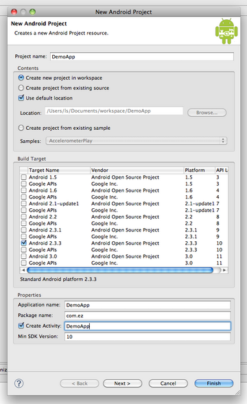 You can then enter some details for the new project. Enter “DemoApp” as the project name, select “Android 2.3.3” from the “Build Target” list, enter “DemoApp” as the application name, and enter “com.ez” as the package name. Make sure that the checkbox “Create Activity” is marked (an activity is the application’s presentation layer), enter “DemoApp” in the adjacent field, and enter “10” as the minimum SDK version. Finally, click the “Finish” button.