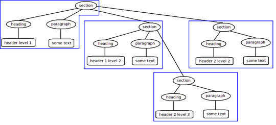 As a short example, the content of an XML field could be visualized as tree structure as shown in the following graphic. The ellipses (for example "section") are the XML tags, while the rectangles represent the content. If the elements of each section are included in one index node, the blue boxes show which XML elements are combined together. [4]