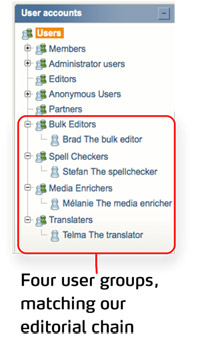 Create, from the «User accounts» tab in the administration interface, as many user groups as your editorial chain requires. Then create our main characters in their respective groups (remember, Brad, Stefan, Mélanie, Telma).