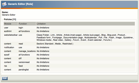 The first step will be to copy the built-in «Editor» , role, and slightly modify it. It is too permissive in our current use-case. Here is the new “Generic Editor” :