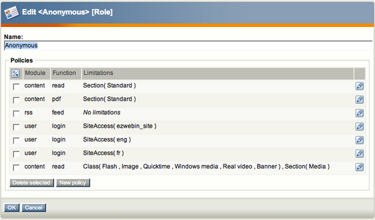 - Modify the anonymous user access permissions in the Administration Interface.Access the User accounts tab, then click on the Roles and policies link on the left menu. Edit the role for the Anonymous user, then edit the user/login policy that is now blank, in order to add the new siteaccess name “fr”. Click the OK button to save your changes.